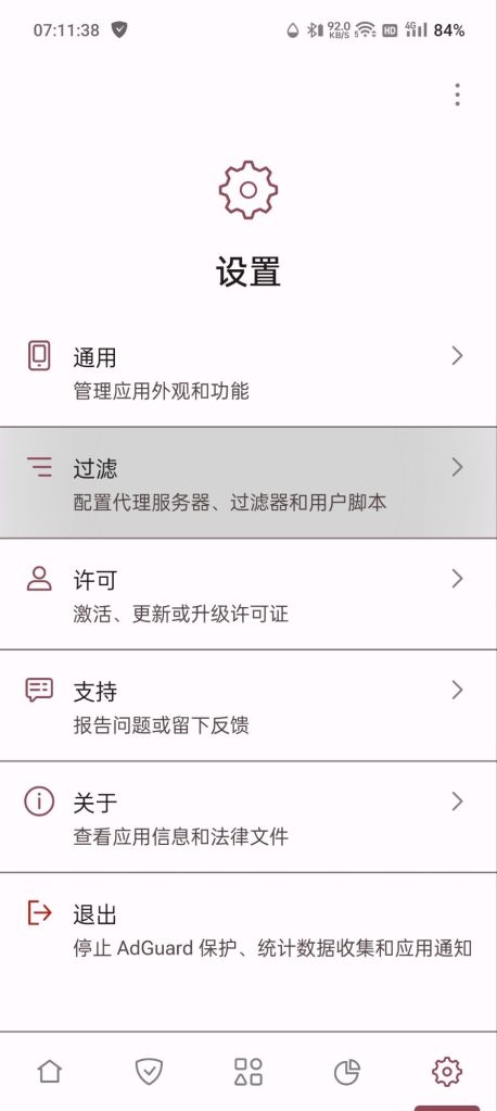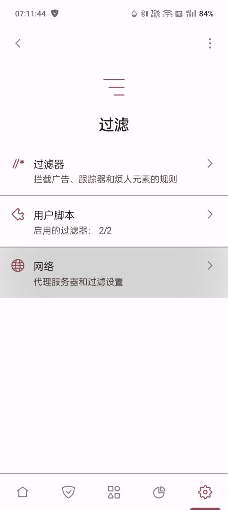 3.来到adguard,在adguard设置中进入过滤栏目/网络/代理服务器/添加代理