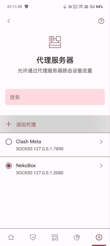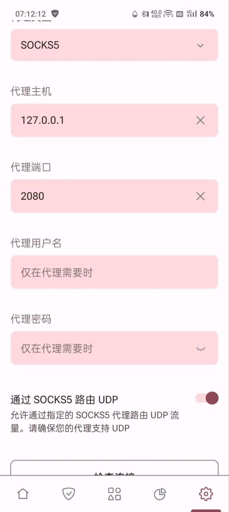 4.配置NekoBox代理服务器,像图中一样填写参数就行(这里的代理端口为nekobox默认端口,如果你更改过nekobox的端口那就自行替换为你更改后的端口),填写完后选择下方的检查连接看看是否提示代理可用,提示可用便选择保存,如果不可用便检查自己是不是哪一步操作错了